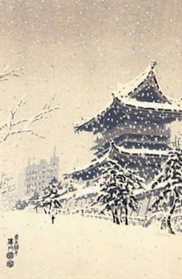 The first and third prints turn our gaze toward Buddhism in Kyoto. Within these scenes, one can almost sense the subtle rhythms of everyday life—monks moving through temple corridors, pilgrims pausing in quiet reverence, and the enduring calm of temple precincts. Through Kotozuka’s eyes, Kyoto’s cultural legacy unfolds softly, revealing a city where the past continues to breathe within the present.