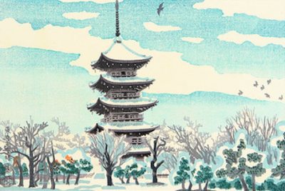 The serene city of Nara stands as one of the great cradles of Japanese high culture. It was here in the eighth century that Buddhism was elevated to the role of “guardian of the state” under the guidance of Emperor Shōmu, shaping the ethical, spiritual, and artistic foundations of the nation. In the print above, Kotozuka captures the quiet dignity and natural grace of Nara, rendering its sacred landscape with a tender stillness that gently invites contemplation.