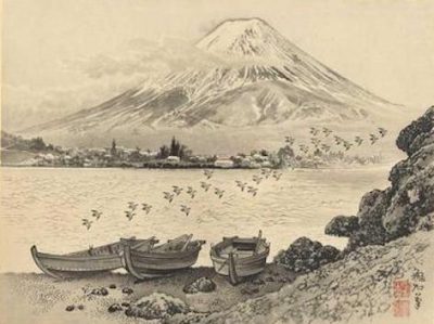 The final print, depicting Lake Kawaguchi beneath the timeless presence of Mount Fuji, captures a moment of hushed contemplation. Birds glide through the open sky, while empty boats rest upon still waters, suggesting both absence and serenity. In this closing image, Jokata Kaiseki leaves us not with resolution, but with reflection—an invitation to linger in silence before the mountain that has witnessed all ages.